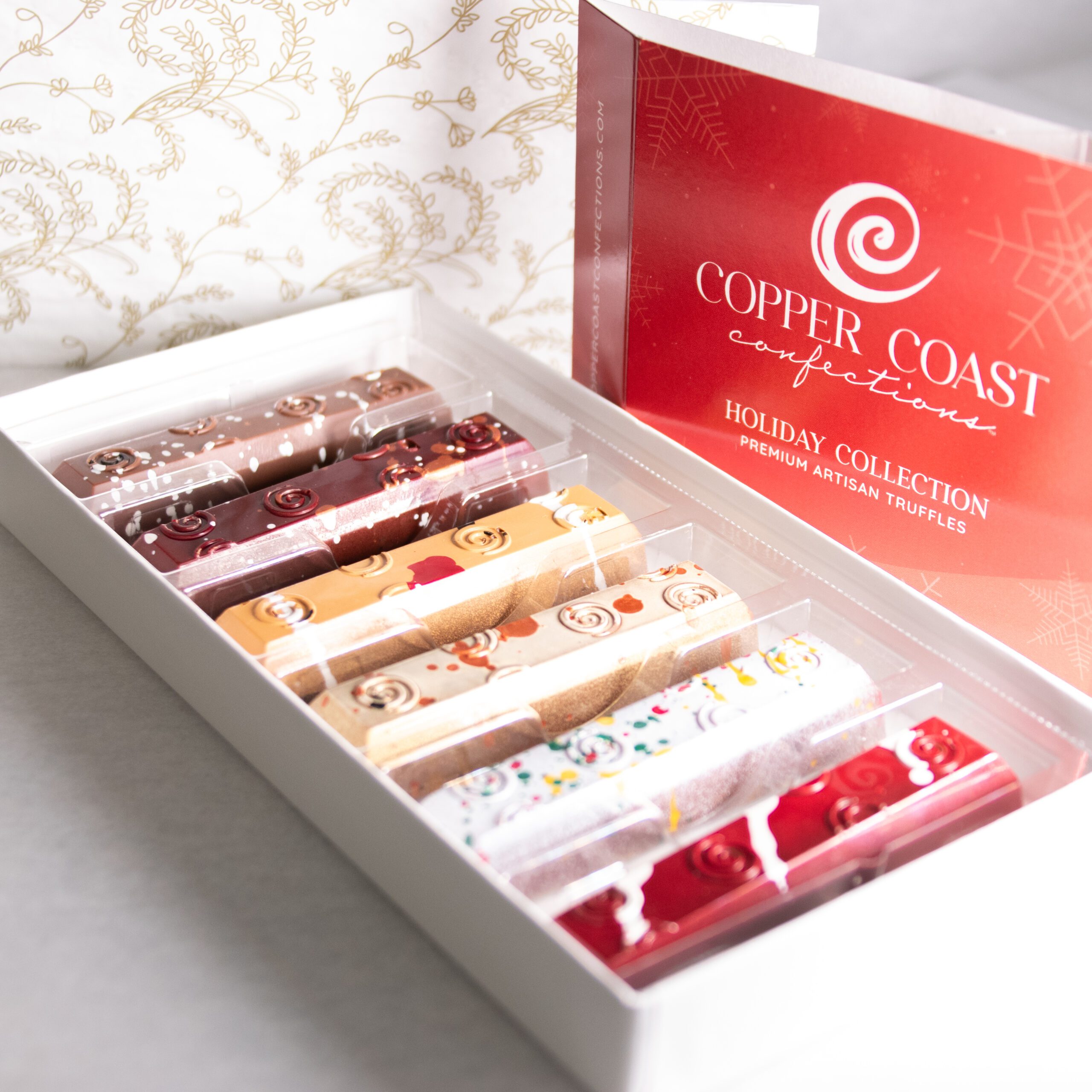 Copper Coast Confections specializes in hand-crafted artisan chocolates using only the finest ingredients available. Each truffle made with fresh cream has a velvety smooth ganache center that’s coated in a Belgian chocolate shell, hand-painted with bright and fun cocoa butters so no two are alike! Gluten free, 0 grams of trans fat, and only 100 calories per truffle!